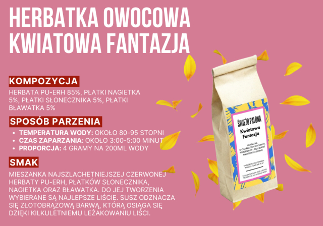 Kwiatowa Fantazja to mieszanka najszlachetniejszej czerwonej herbaty Pu-erh, płatków słonecznika, nagietka oraz bławatka. Do jej tworzenia wybierane są najlepsze liście. Susz odznacza się złotobrązową barwą, którą osiąga się dzięki kilkuletniemu leżakowaniu liści.