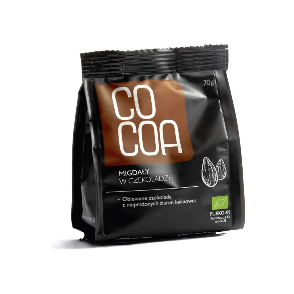 Migdały w czekoladzie Cocoa to ekologiczne migdały oblane wysokiej jakości czekoladą, wyprodukowaną wyłącznie z certyfikowanych składników ekologicznych. Czekolada została wyprodukowana z surowego, nieprażonego kakao - połączenie najszlachetniejszego z orzechów i ciemnej czekolady z charakterystyczną cytrusową nutą.