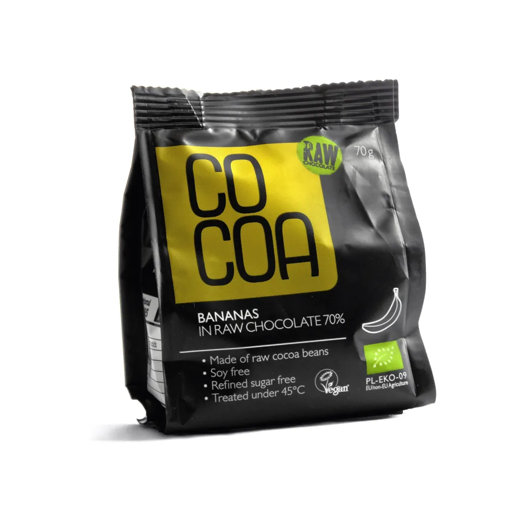 Banany w surowej czekoladzie Cocoa to suszone chipsy bananowe oblane ciemną, surową czekoladą. Naturalna słodycz banana w połączeniu z intensywną czekoladą o cytrusowym akcencie tworzy harmonijną kompozycję. Chipsy bananowe to klasyka w nowej, czekoladowej odsłonie - idealna przekąska dla każdego!
