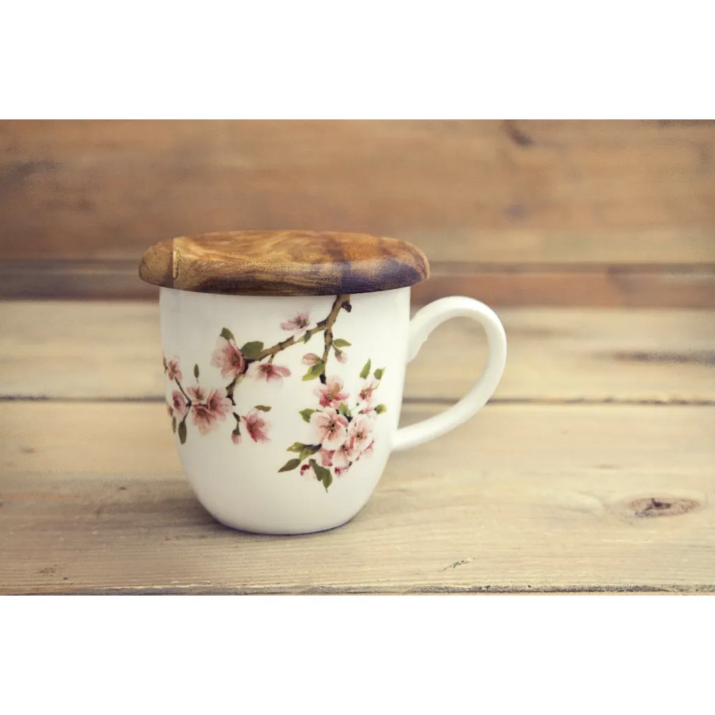 To piękny porcelanowy kubek z akacjową przykrywką, która jednocześnie pełni funkcję podstawki. Innymi słowy najpierw pomoże Ci zaparzyć bardziej aromatyczny napar, a później ochroni podłoże przed śladami po gorącym naczyniu.