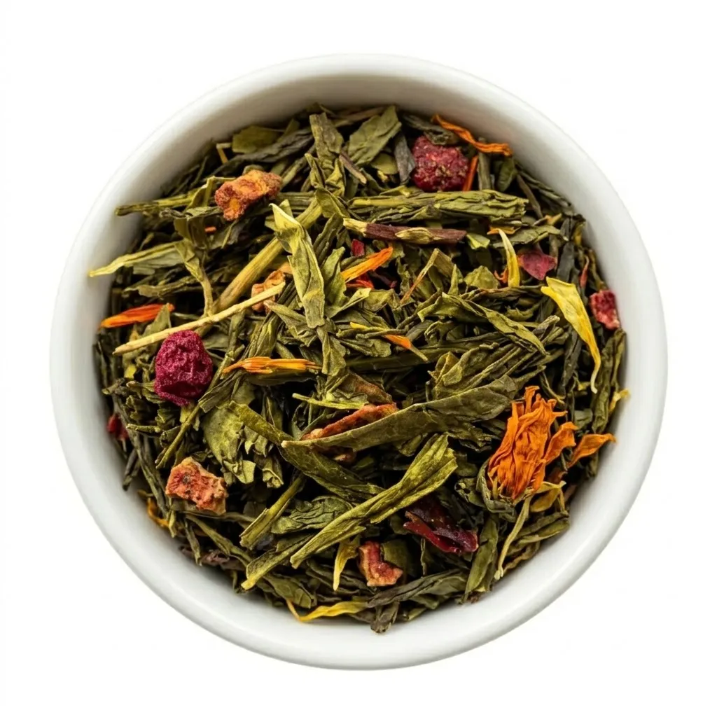 Składniki: liście zielonej herbaty 80%, owoc truskawki 5%, krokosz barwierski 5%, kwiat piwonii 2,5%, aromat 2,5%