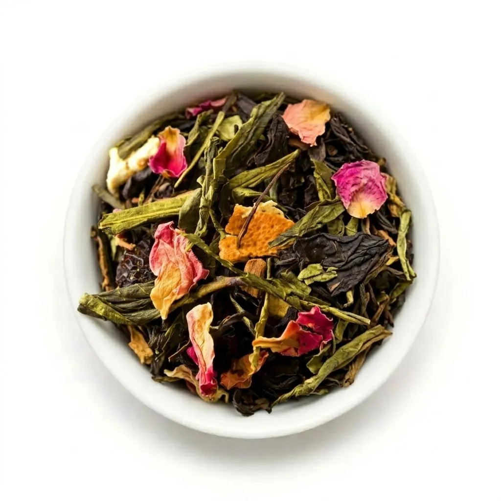 Składniki: herbata czarna liść 40%, herbata zielona Sencha 30%, rodzynki 10%, skórka pomarańczy 10%, cynamon 5%, płatki róży 2,5%, aromat 2,5%