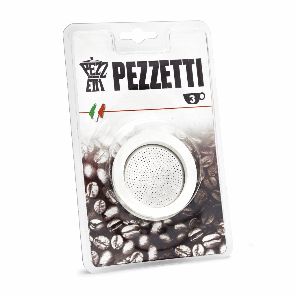 Pezzetti zestaw zawierający gumowe uszczelki i sitko do kawiarek aluminiowych Pezzetti. Rozmiar 3 espresso.