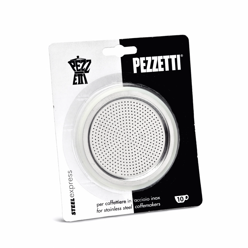 Pezzetti zestaw zawierający dwie silikonowe uszczelki i sitko do kawiarek stalowych Pezzetti. Rozmiar 10 espresso.