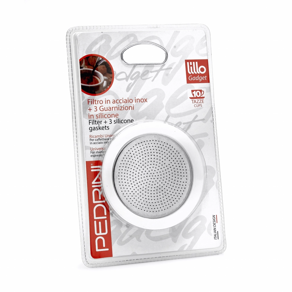 Zestaw uszczelek i sitko do kawiarek stalowych włoskiej firmy Pedrini. W zestawie znajdują się trzy uszczelki i jedno sitko, które bardzo prosto można wymienić. Jeden zestaw starcza minimalnie na rok użytkowania. Maksymalnie na 3 lata.