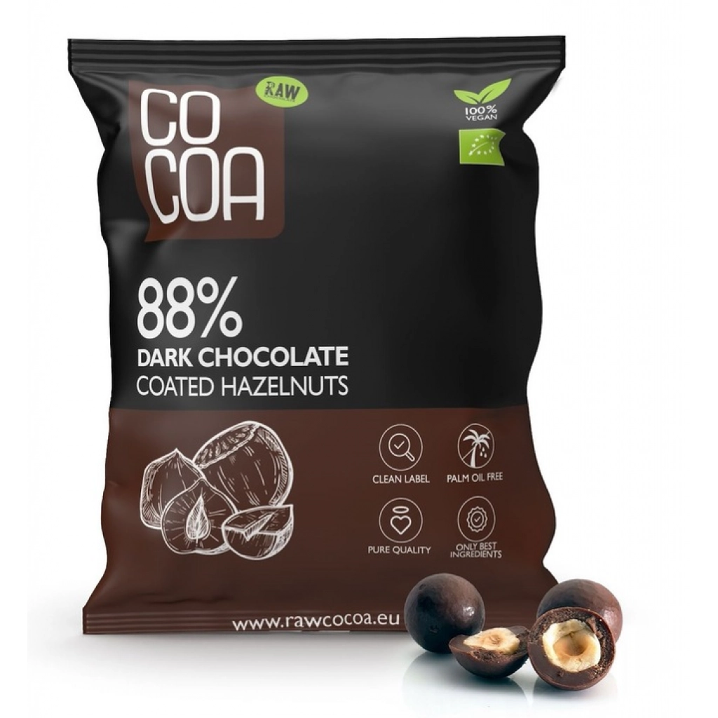 Orzechy laskowe w ciemnej czekoladzie 88% Cocoa to ekstremalna propozycja dla prawdziwych koneserów gorzkiej czekolady. Aromatyczne orzechy laskowe (35%) oblane intensywną czekoladą o zawartości 88% kakao - minimalna ilość cukru kokosowego pozwala w pełni wyeksponować mocny, autentyczny smak surowego kakao i orzechów.
