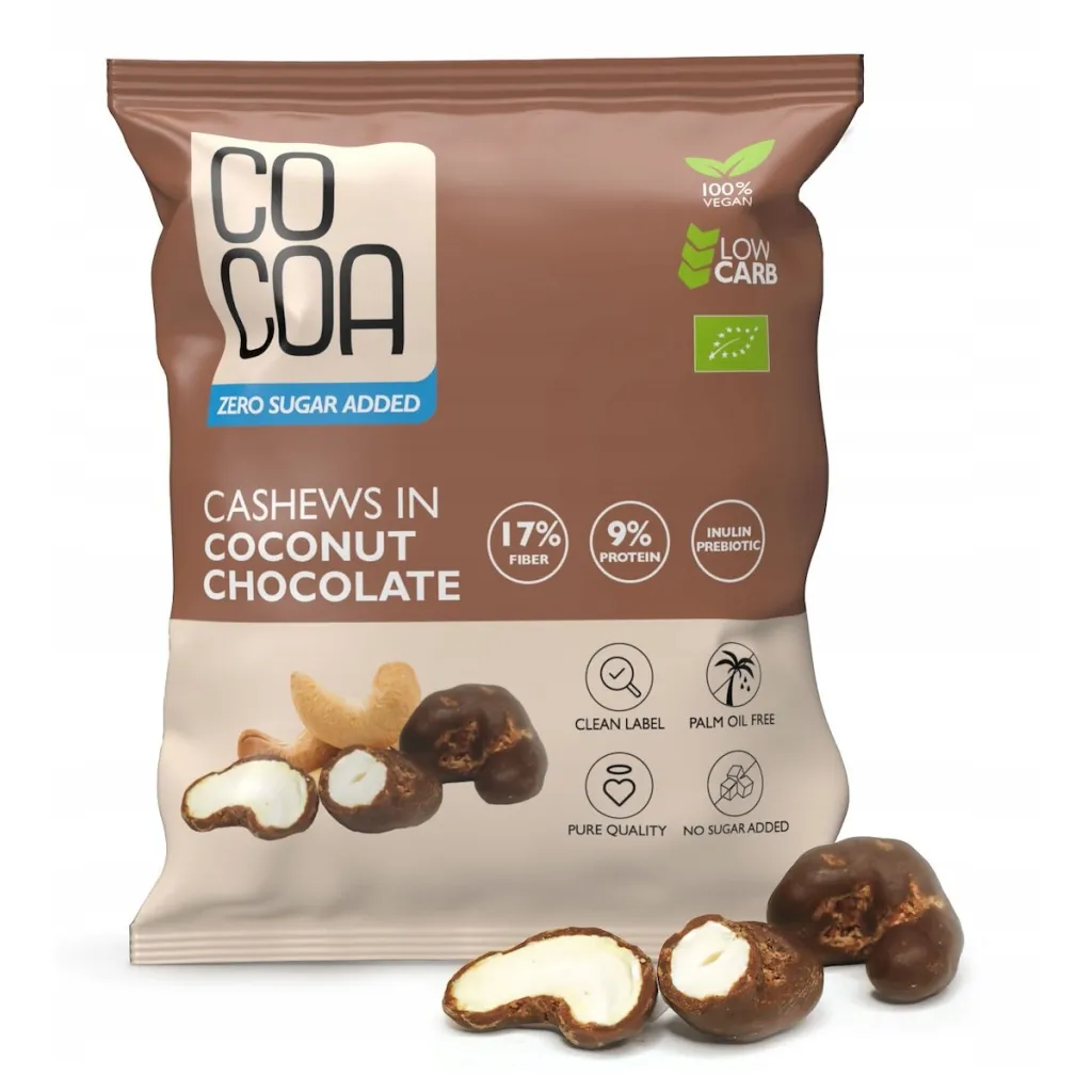 Orzechy nerkowca w czekoladzie kokosowej Cocoa to wyjątkowe połączenie kremowych orzechów nerkowca z wegańską czekoladą o intensywnym kokosowym smaku. Orzechy nerkowca oblane delikatną, kremową czekoladą z dodatkiem 12% kokosa tworzą harmonijną kompozycję tropikalnych smaków. Przekąska BIO dla miłośników egzotycznych połączeń.