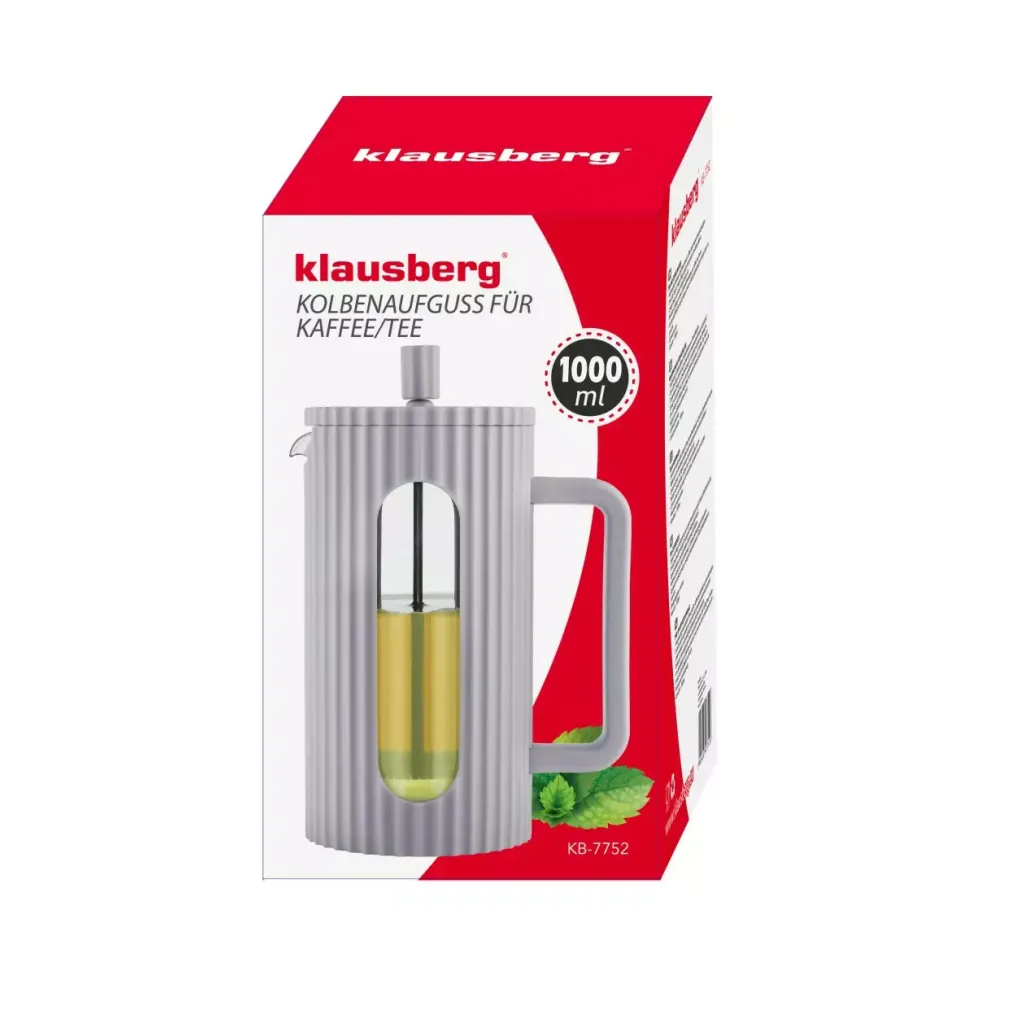 Zaparzacz do kawy i herbaty Klausberg o pojemności 1 litra w kolorze szarym to elegancki i funkcjonalny produkt, który idealnie sprawdzi się w każdej kuchni. Wykonany z wysokiej jakości materiałów, zaparzacz wykorzystuje tłokowy filtr typu French Press, który precyzyjnie oddziela fusy od naparu, zapewniając idealnie klarowny i aromatyczny napój.