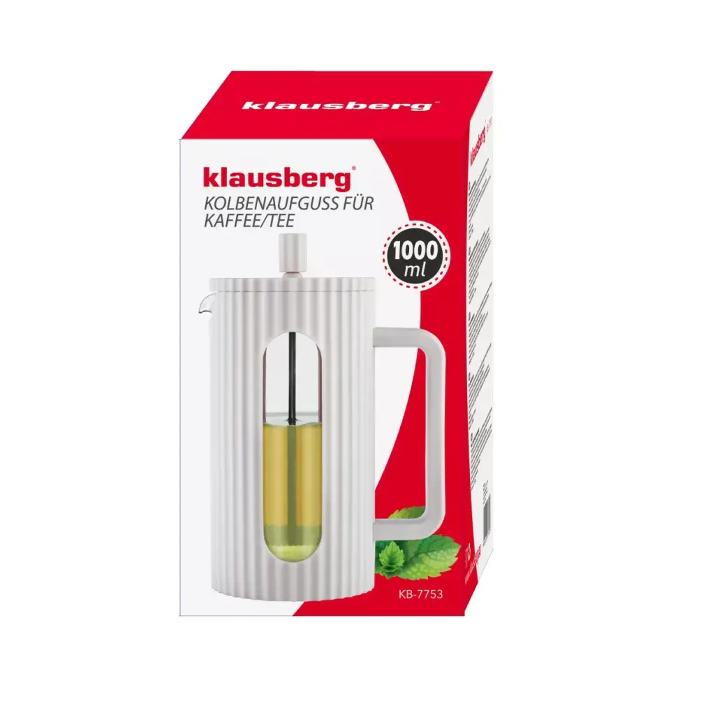 Zaparzacz do kawy i herbaty Klausberg o pojemności 1 litra w kolorze kremowym to elegancki i funkcjonalny produkt, który idealnie sprawdzi się w każdej kuchni. Wykonany z wysokiej jakości materiałów, zaparzacz wykorzystuje tłokowy filtr typu French Press, który precyzyjnie oddziela fusy od naparu, zapewniając idealnie klarowny i aromatyczny napój.