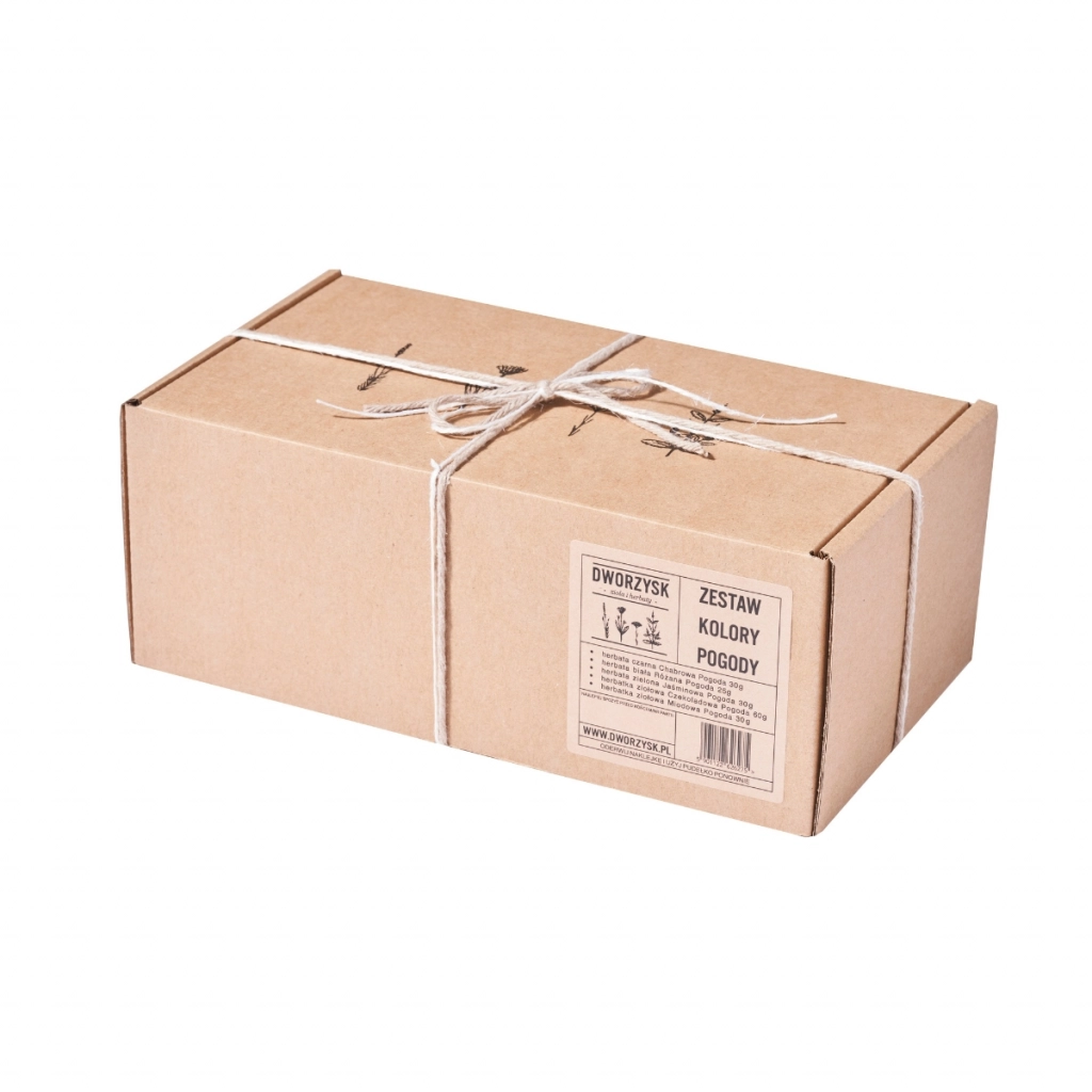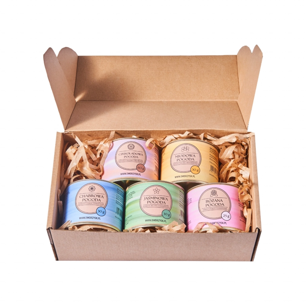 Zestaw Dworzysk Kolory Pogody to herbata na każdą aurę i nastrój. W skład tego wyjątkowego kompletu wchodzą trzy herbaty klasyczne z dodatkami — czarna Chabrowa Pogoda, zielona Jaśminowa Pogoda oraz biała Różana Pogoda — każda wzbogacona naturalnymi kwiatami, owocami i ziołami. Dopełniają je dwie ziołowe kompozycje: Miodowa Pogoda na bazie miodokrzewu oraz Czekoladowa Pogoda z rooibosem, idealne na relaksujące chwile o dowolnej porze dnia.