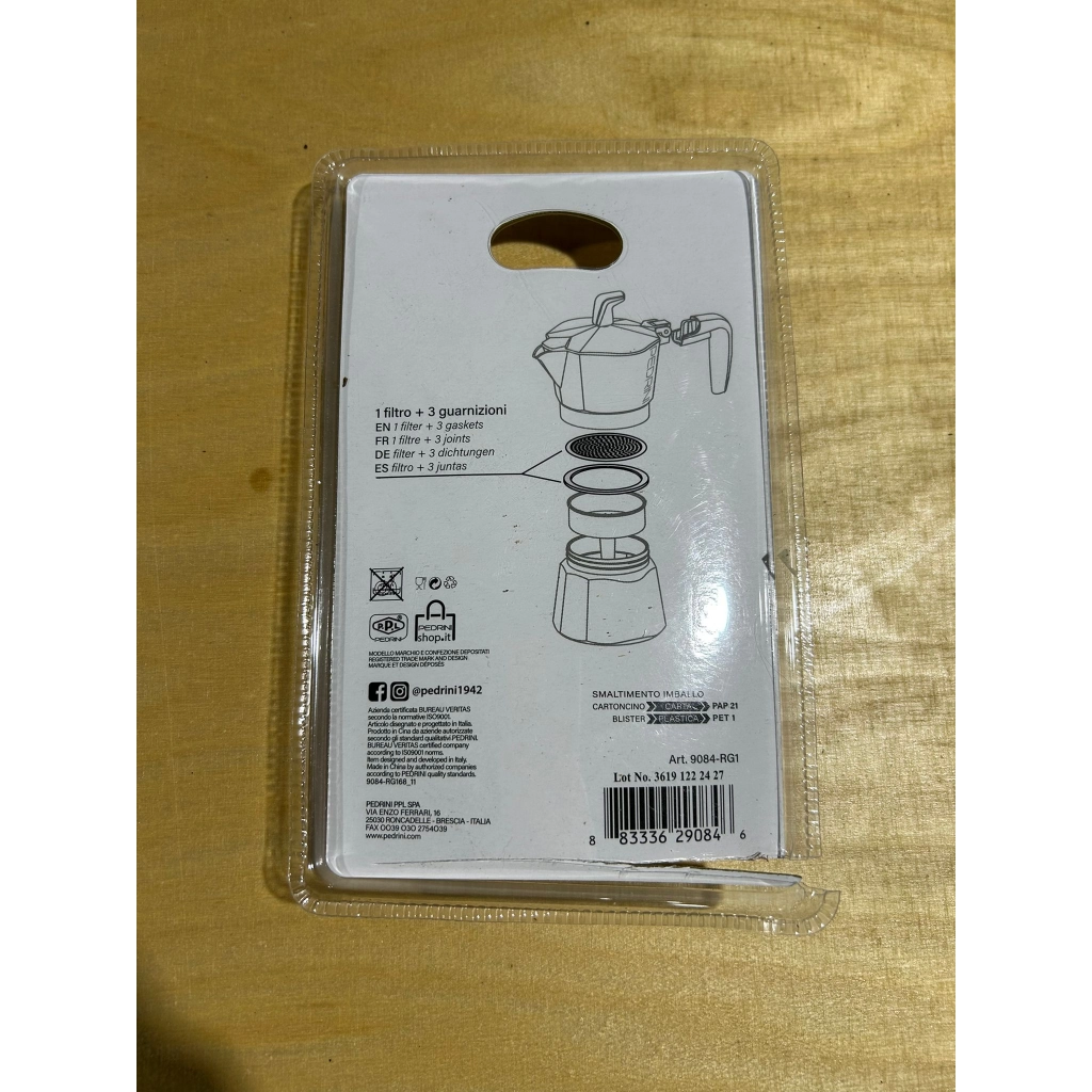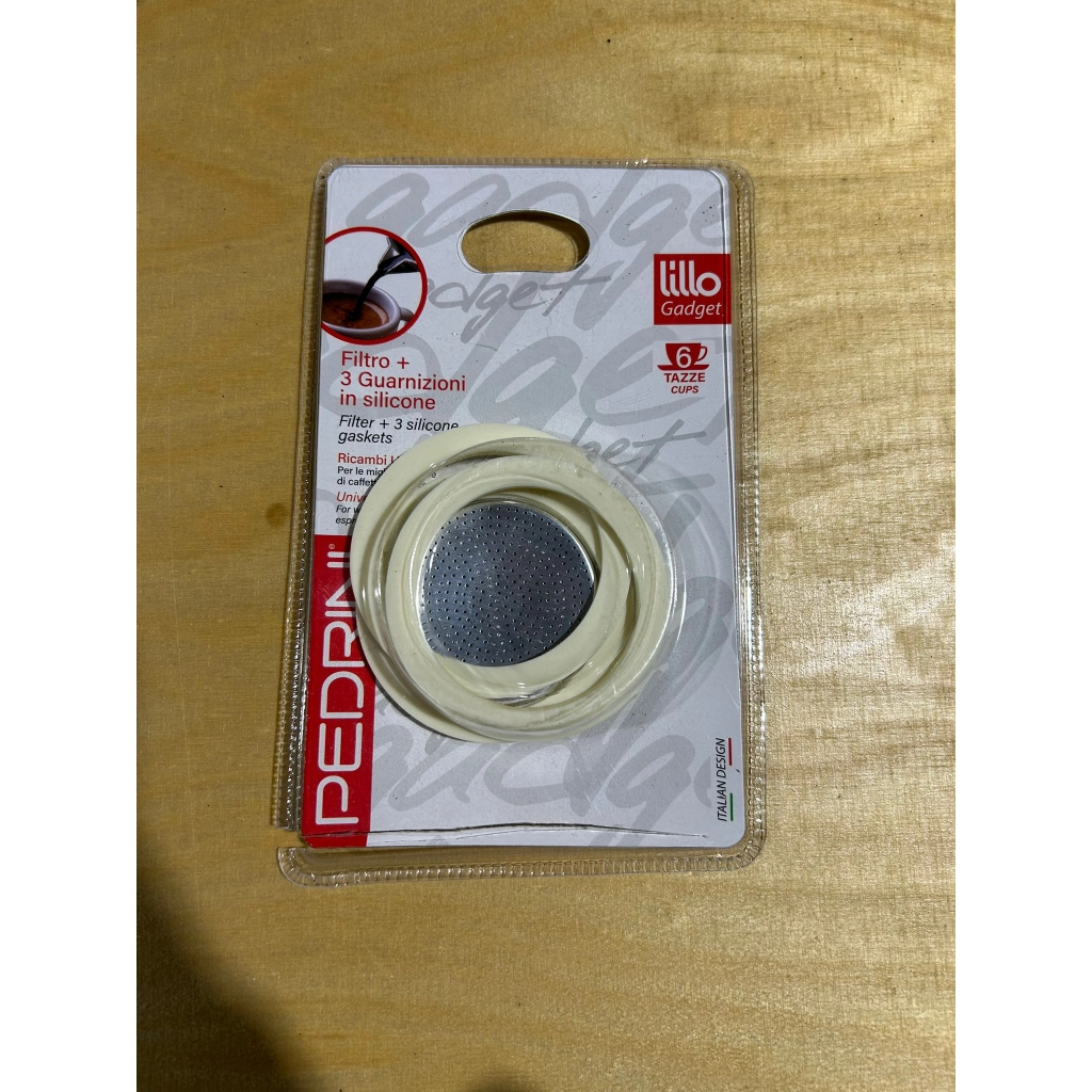 Zestaw uszczelek i sitko do kawiarek aluminiowych włoskiej firmy Pedrini. W zestawie znajdują się trzy uszczelki i jedno sitko, które bardzo prosto można wymienić. Jeden zestaw starcza minimalnie na rok użytkowania. Maksymalnie na 3 lata.