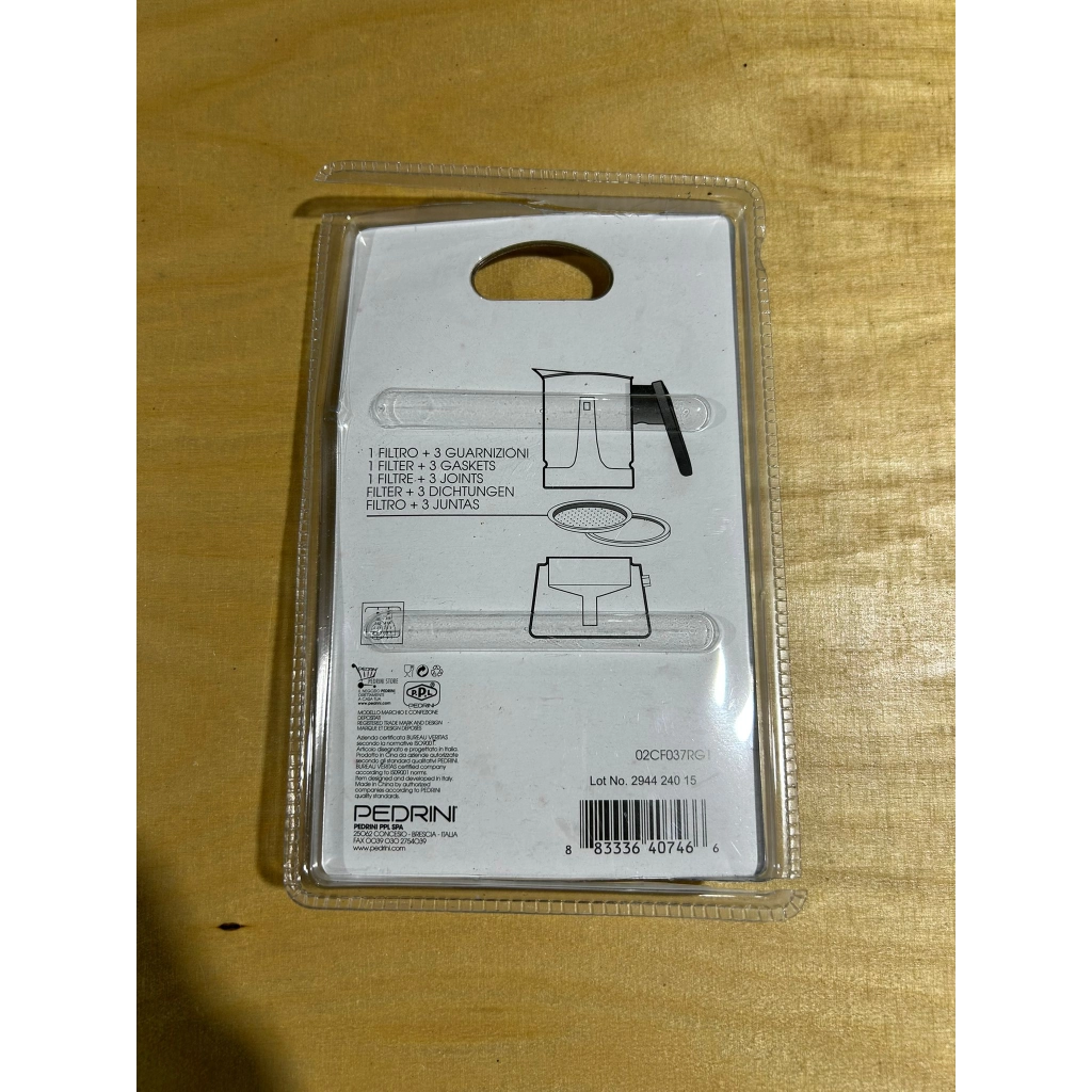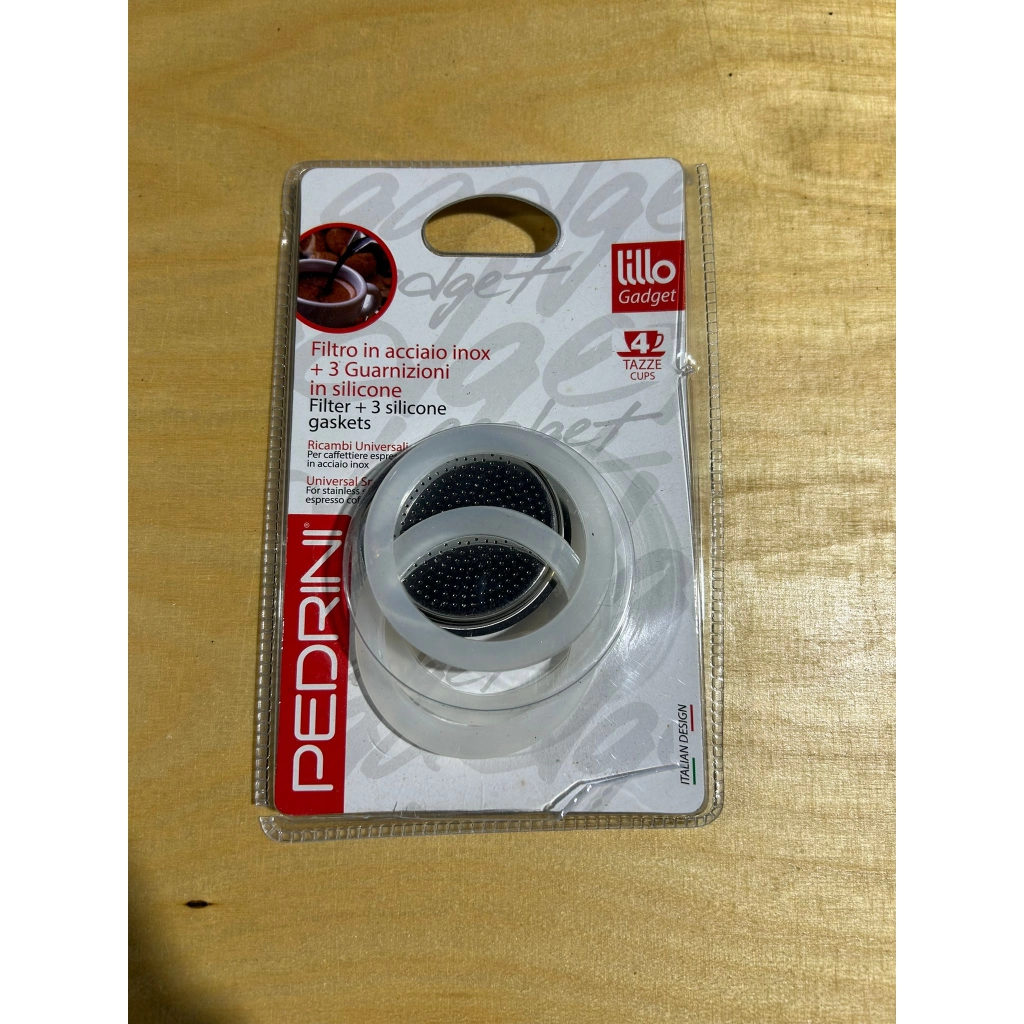 Zestaw uszczelek i sitko do kawiarek stalowych włoskiej firmy Pedrini. W zestawie znajdują się trzy uszczelki i jedno sitko, które bardzo prosto można wymienić. Jeden zestaw starcza minimalnie na rok użytkowania. Maksymalnie na 3 lata.